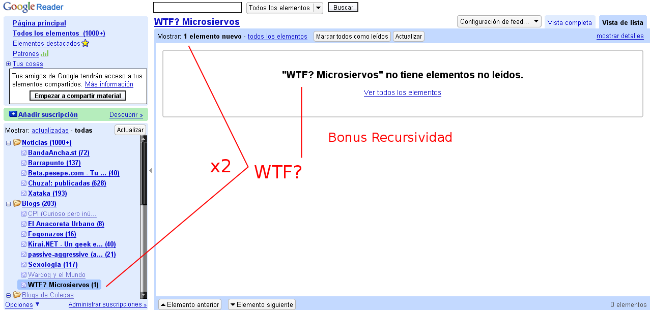 A veces al Google Reader se le cruzan los cables y pasa algo tan WTF como que te diga que tienes un elemento sin leer en un canal en el que tienes todos los elementos leídos, duplica el WTF el hecho de que lo diga en dos sitios, pero más WTF es que esto ocurra en el canal RSS de WTF? Microsiervos, lo cual lo convierte en un WTF Recursivo